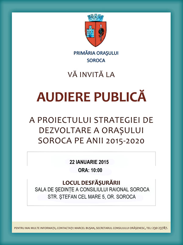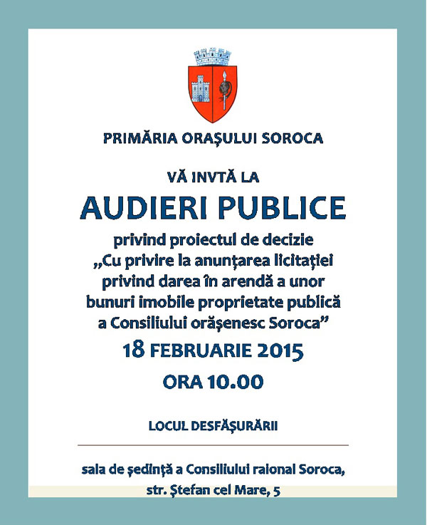 Joi, 29 ianuarie 2015 cu începere de la ora 10.00, în sala de ședință a Consiliului raional, va avea loc ședința extraordinară a Consiliului orășenesc Soroca cu ordinea de zi: