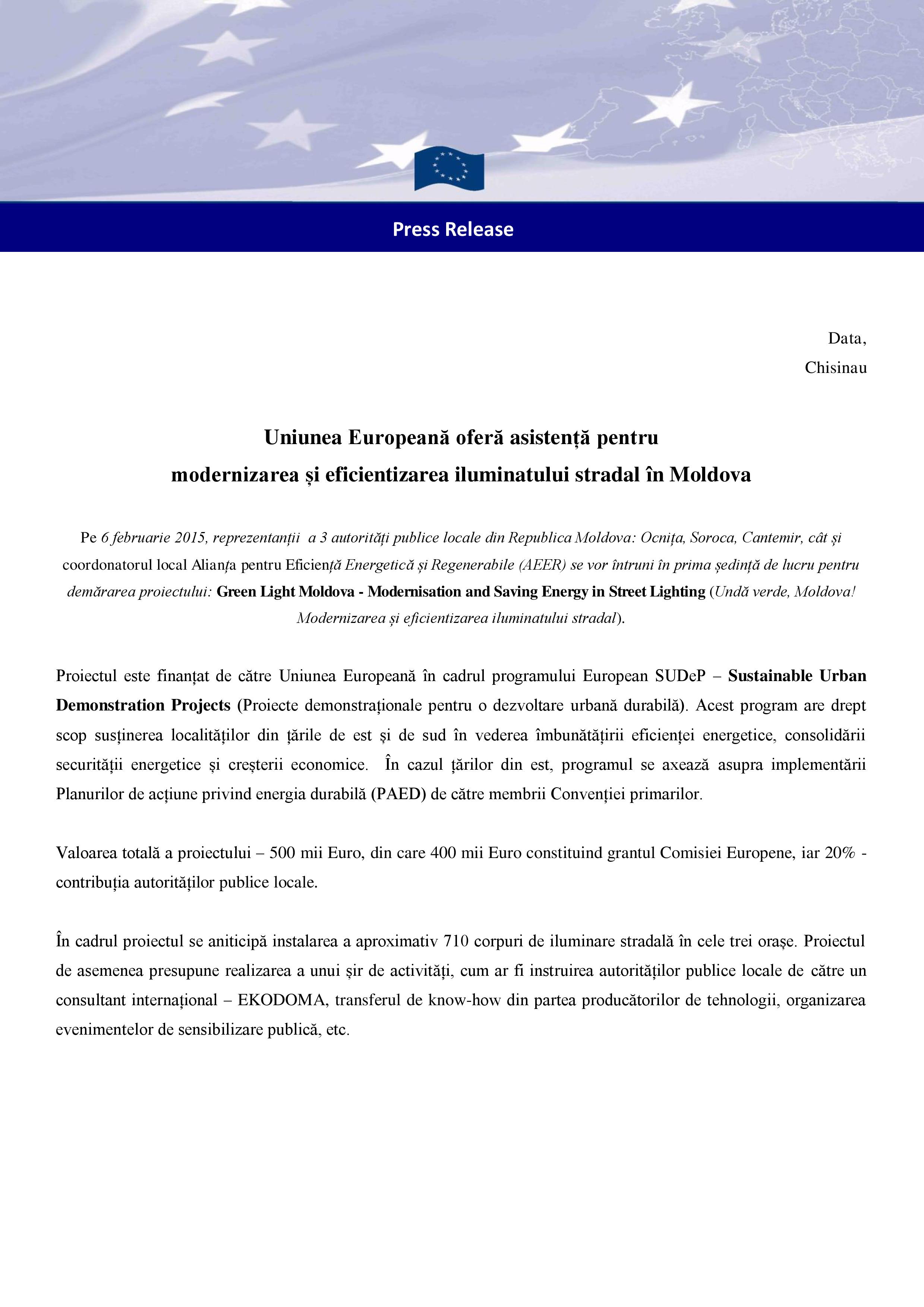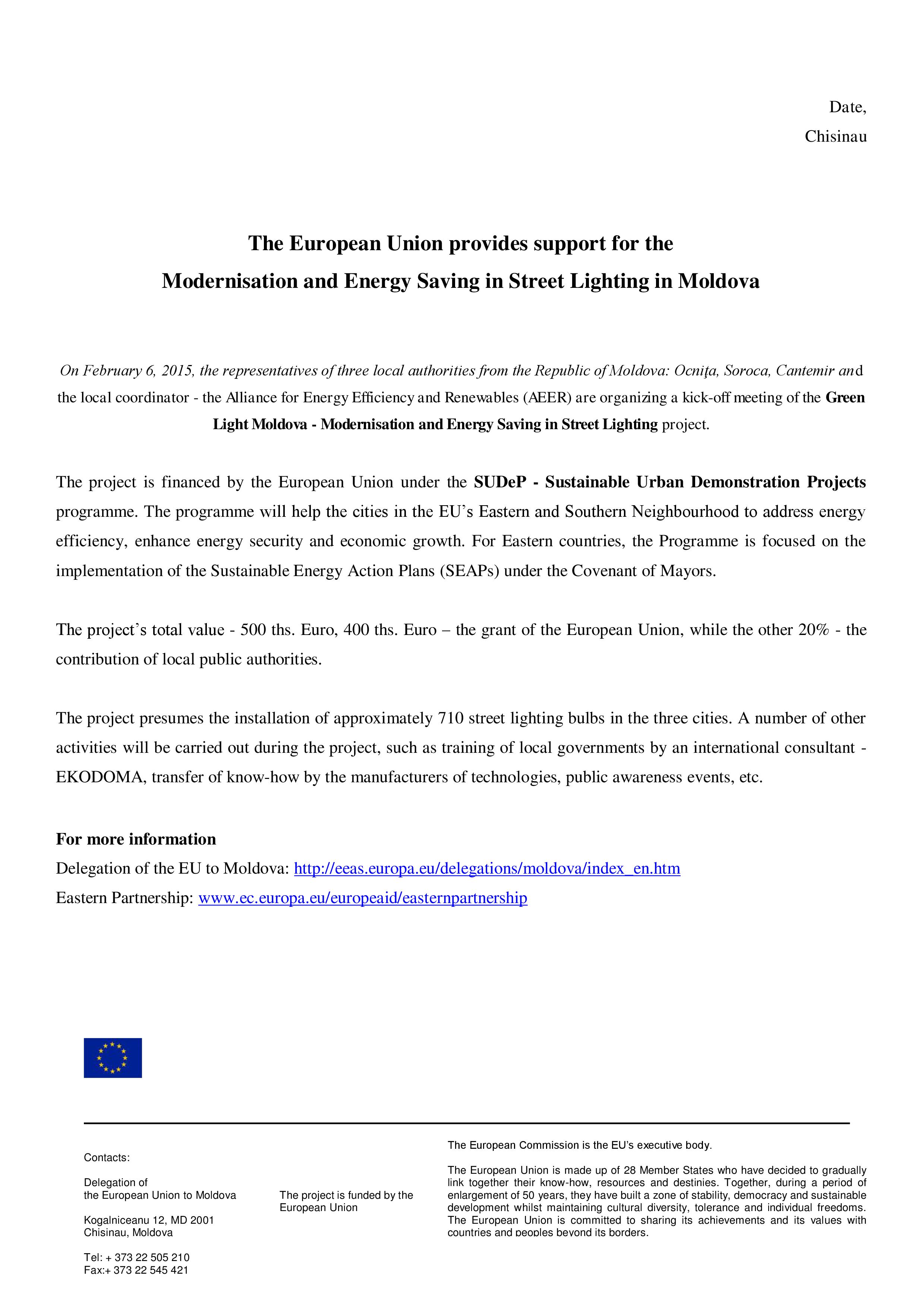 Pe 6 februarie 2015 la Chişinău a avut loc lansarea proiectului în 3 localităţi Ocniţa, Soroca, Cantemir „Undă verde Moldova! Modernizarea ...Detalii